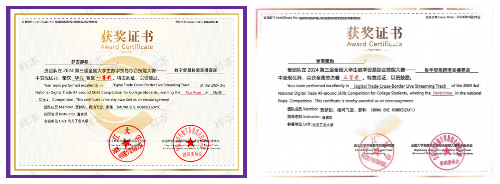 近日由浙江大学中国数字贸易研究院主办、全国大学生数字贸易综合技能大赛组织委员会承办的第三届全国大学生数字贸易综合技能大赛总决赛在浙江大学圆满落幕。我校学生贾孟甜、那和、杨鸿飞雪组成的代表队在华北赛区区域赛中获赛区一等奖,在全国总决赛中获全国三等奖。