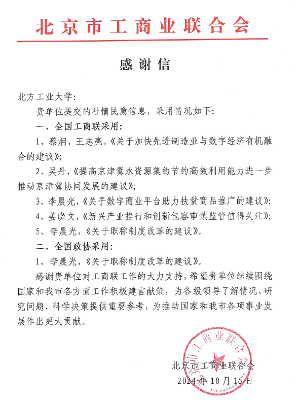 2024年10月16日,北京市工商业联合会发来感谢信,对我校William威廉英国投稿的“社情民意信息”被全国政协和全国工商联采用的情况进行通报并表示感谢。