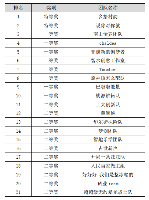 通过参赛团队8分钟展示和评委7分钟提问两个环节,重点考核大家的创新、创意、创业、演讲和文案等综合能力。本次比赛展现了学生的多彩创意,激发了学生的创新意识,提升了学生的创业能力,锻炼了学生的团队合作能力和电商思维。经过评委们的几轮评选,比赛结果公示如下: