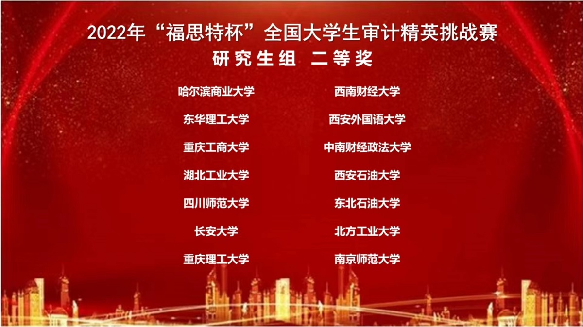 “福思特杯”全国大学生审计精英挑战赛是目前财会审计类专业具有较大影响力的全国性赛事之一。本次大赛由中国审计学会审计教育分会主办、南京审计大学政府审计学院承办。大赛的目的是积极探索审计专业发展的新视域、新路径和新方法,创新实现大数据、区块链等信息技术与审计专业教育的深度融合,培养适应社会经济发展需要的高素质、专业化审计人才。大赛至今已成功举办四届,累计吸引了来自全国29个省市的200多所高校,近5000名师生参与。我校会计系是第二次派出研究生队伍参加此项比赛,并首次取得二等奖的佳绩。