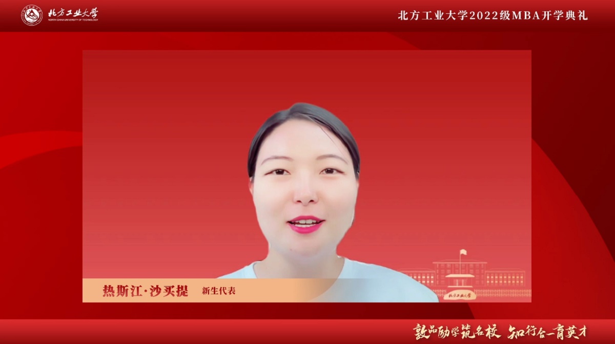 2022级非全日制MBA班热斯江·沙买提同学作为新生代表发言并感谢williamhillMBA给自己重回校园学习的机会。她表示,MBA的学习将是自己人生最重要的转折点之一,未来她将常怀求知之心,不断探索突破。同时她也期待与同学们在北方工大MBA的学习过程中见证彼此的努力和精彩,共同度过充实而美好的校园时光。