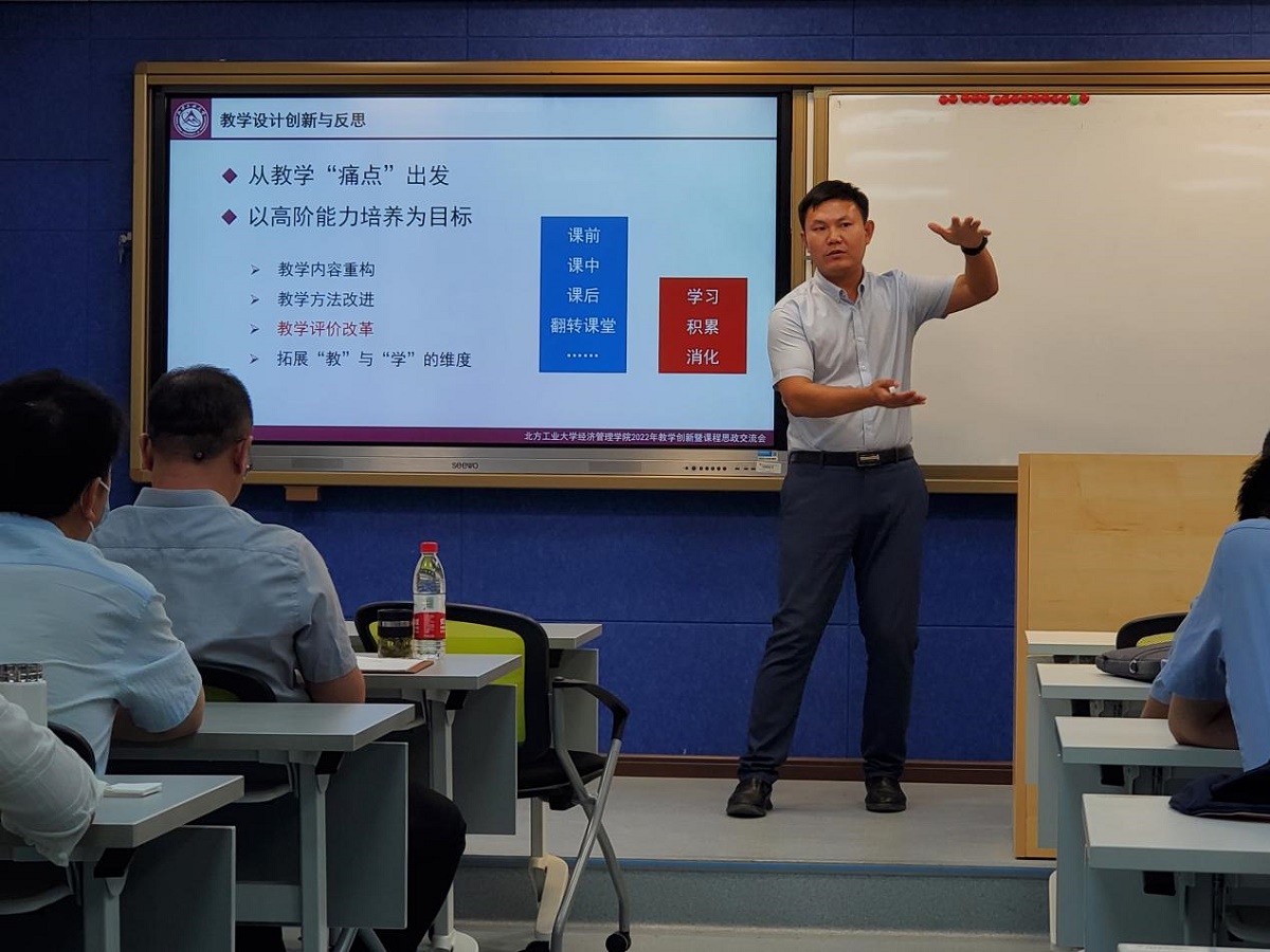“首届全国高校教师教学创新大赛一等奖”获得者、建筑与艺术学院教师李道勇首先做了经验分享。李老师首先对前两届比赛规则进行了详细解读,介绍了教学创新大赛相关材料的准备工作。随后,李老师详细介绍了教学创新设计新的经验。他指出,要从教学的痛点出发,实现高阶能力培养的目标。李老师强调,在教学过程中,要结合OBE教学理念,做到反向设计、和正向实施,通过动态调整,从而达到持续优化。