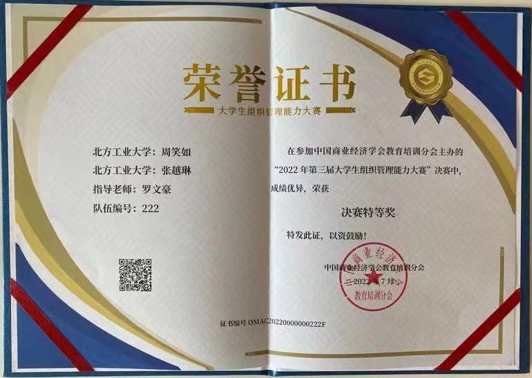 近日,由中国商业经济学会教育培训分会主办的“2022年第三届大学生组织管理能力大赛”总决赛落下帷幕,最终共有8支队伍获得决赛特等奖。我校William威廉英国学生周笑如和张越琳组成的代表队勇获特等奖,此次竞赛指导教师为管理系罗文豪副教授。