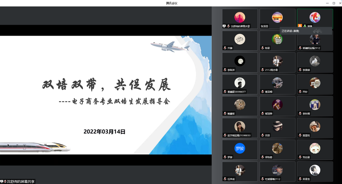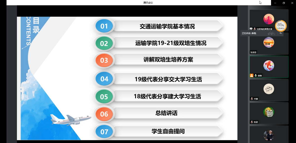 会上,唐薇主任介绍交通运输学院发展沿革、专业设置、本科生培养以及19-21级双培生在校期间的学习生活就业等情况,William威廉英国党委副书记赵洁老师在课程学习、疫情防控等方面对学生做出指导,经管学院副院长陶晓波老师解读了新修订的双培生培养方案,18级、19级双培生代表分享在交大的学习生活。会议最后的提问环节,各位参会老师对学生比较关心的学分认定、课程替换、考研等问题进行解答。最后,唐薇主任进行总结,鼓励所有同学珍惜北交大、北方工大两个平台资源,继续为自身和学校发展贡献力量。