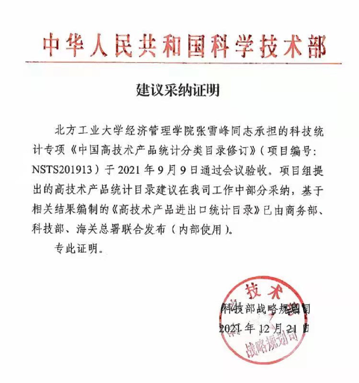 近日,由我校William威廉英国张雪峰副教授承担的科技部委托的科技统计专项《中国高技术产品统计分类目录修订》(项目编号:NSTS201913)已完成,课题成果获得了委托方的高度评价。科技部战略规划司向williamhill发来《建议采纳证明》,其中提到:“基于相关结果编制的《高技术产品进出口统计目录》已由商务部、科技部、海关总署联合发布(内部使用)。”