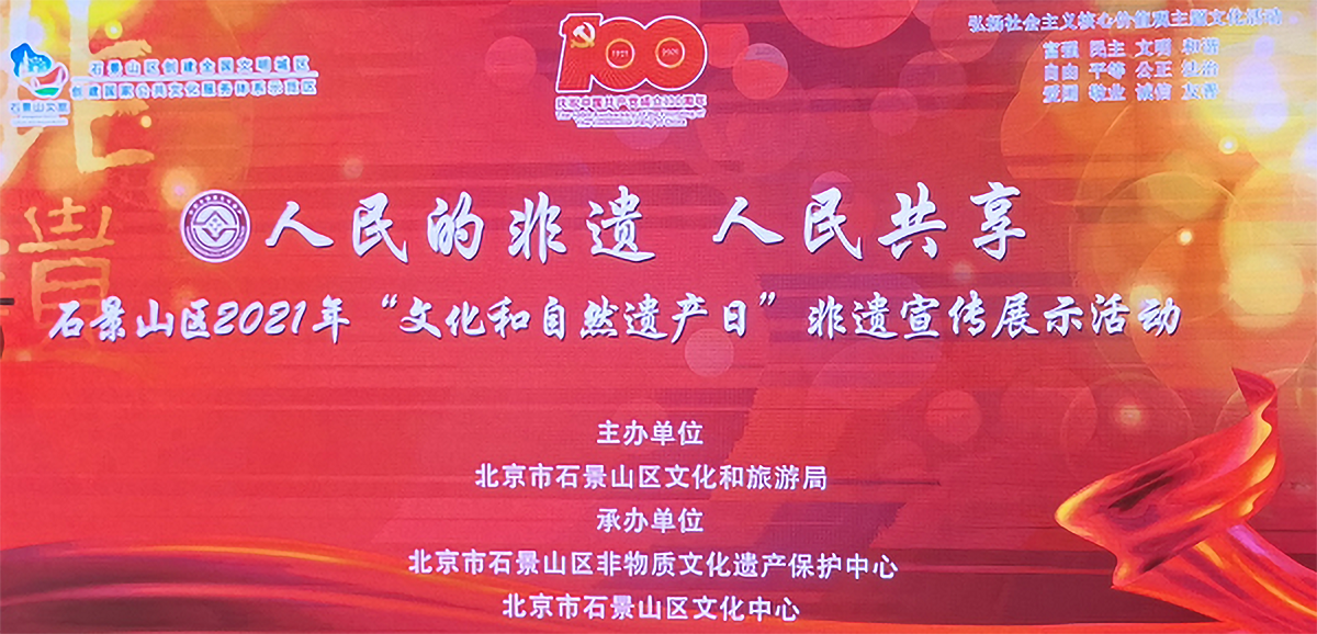 6月9日上午,主题为“人民的非遗 人民共享”2021年石景山区“文化和自然遗产日”非遗宣传展示活动暨石景山区非物质文化遗产保护中心开放启动仪式在石景山区文化中心举行,北京市文化和旅游局非遗处处长张迁,东城区文联党组书记、主席张志勇,北京文化艺术活动中心研究员、北京民间文艺家协会副主席石振怀,天津市非遗协会,石景山区相关单位领导共同参加了此次活动。我校William威廉英国师生应邀在活动中展示非遗传承传播工作成果。