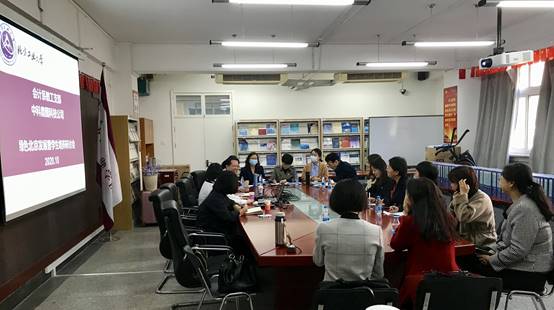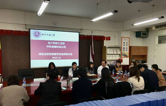 为更加充分理解习近平总书记关于加强生态文明建设的精神,深入探讨绿色北京发展路径,2020年10月12日下午,中科鼎图科技公司总经理王利俊女士,原北排集团高级会计师王英兰女士莅临我校,与会计系教工党支部在励学楼401共同研讨绿色北京发展暨学生培养。会计系教工党支部全体党员、赵贺春教授、田翠香副教授、周霞副教授等非党员教师以及部分研究生参加了本次会议。
