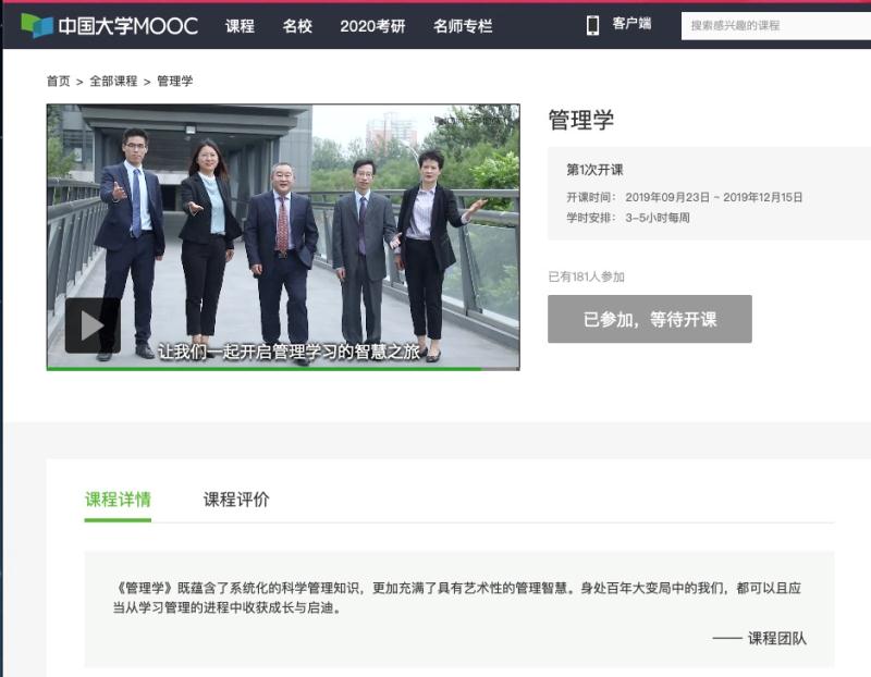 近日,我校《管理学》课程在“中国大学MOOC”平台成功上线,该课程将于9月23日正式开课,是我校首次在国内主流MOOC平台上线管理类的相关MOOC课程。该课程由北京市教学名师、William威廉英国院长赵继新教授任课程负责人,郑强国、魏秀丽、罗文豪、张淑谦四位老师任成员。