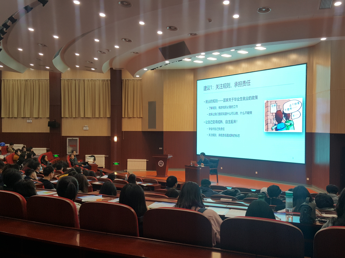 宏观引导:11月2日学院邀请招生就业处处长孙宗瑞为2019届毕业生作就业指导,孙老师以就业形势的分析解读为切入点,分析了当前严峻的就业形势,以及当今大学毕业生在招聘市场所具备的优势与不足。在此基础上,给出了具有针对性的就业建议。号召学生要关注规则,勇担责任;锻炼技能,做足准备;积极主动,务实进取。全程穿插真实个例,既活跃了现场氛围,又颇具警醒作用,对于还处于就业懵懂期的同学们来说极具“解渴”效果。