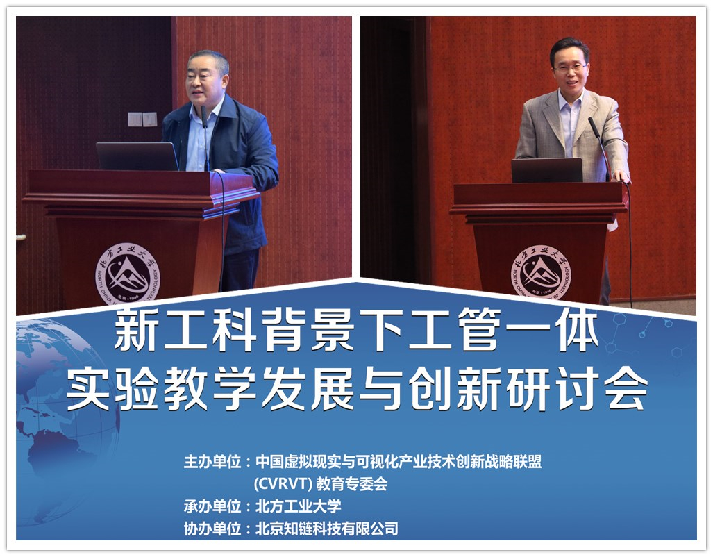 2018年10月27日,“新工科背景下工管一体实验教学发展与创新”研讨会在我校文化会堂举行。本次会议由中国虚拟现实与可视化产业技术创新战略联盟(CVRVT)教育专委会主办,williamhill承办,北京知链科技有限公司协办,围绕新工科建设背景下工管融合发展及实验教学创新与突破展开研讨。来自北京大学、北京航空航天大学、哈尔滨工业大学、华北电力大学、北京工商大学、首都经济贸易大学、北京联合大学、江苏大学、北京信息科技大学、山东理工大学等全国30余所高校、10余家教育科技企业及我校师生共200余人参加了此次会议。会议各环节分别由William威廉英国院长赵继新、党委书记谢朝阳及副院长陶晓波主持。