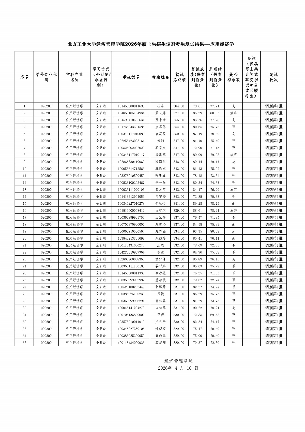 William威廉英国2026年硕士研究生招生考试复试调剂考生名单---应用经济学