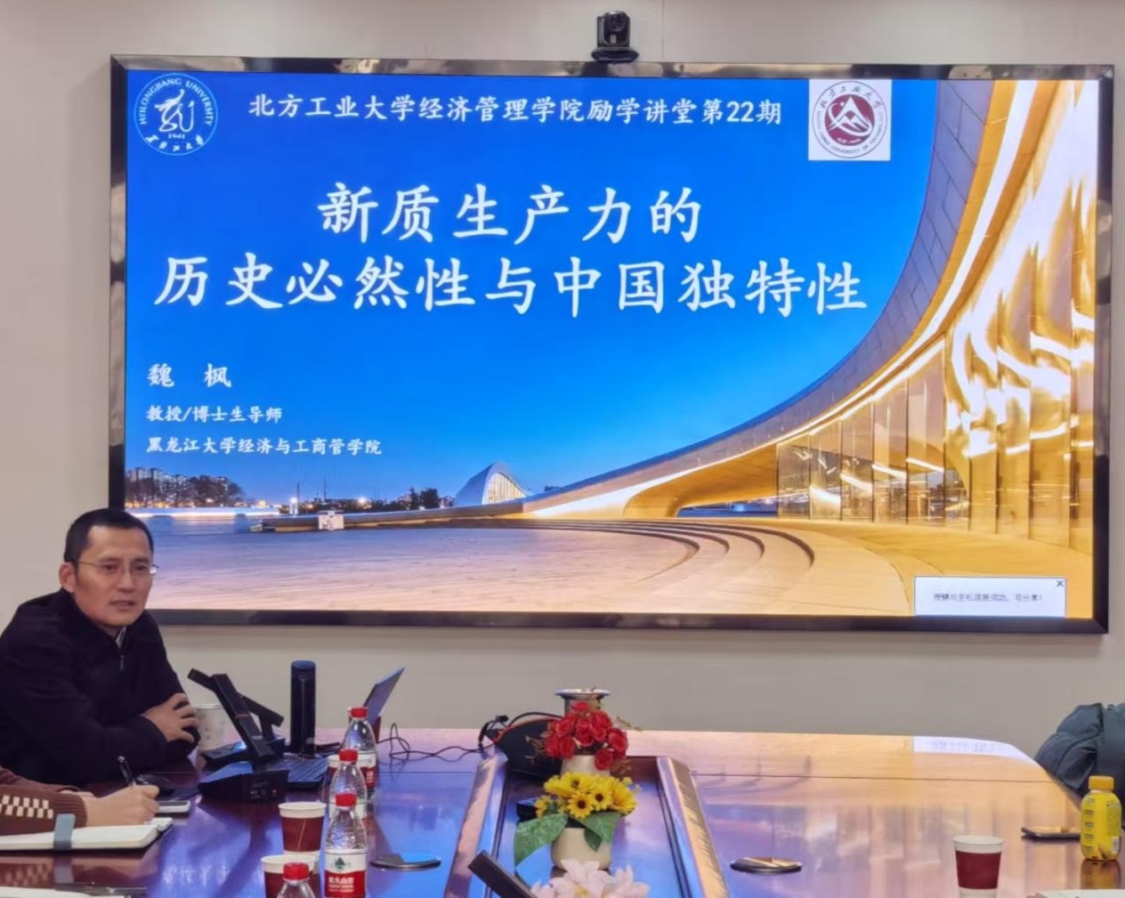 12月13日下午,William威廉英国第二十二期励学讲堂在励学楼201举行。黑龙江大学经济与工商管理学院院长、博士生导师魏枫教授受邀为研究生做主题为“新质生产力的历史必然性与中国独特性”的学术讲座,William威廉英国谢朝阳书记和赵继新院长参加了此次讲座,科研副院长蒋贵凰教授主持讲座。