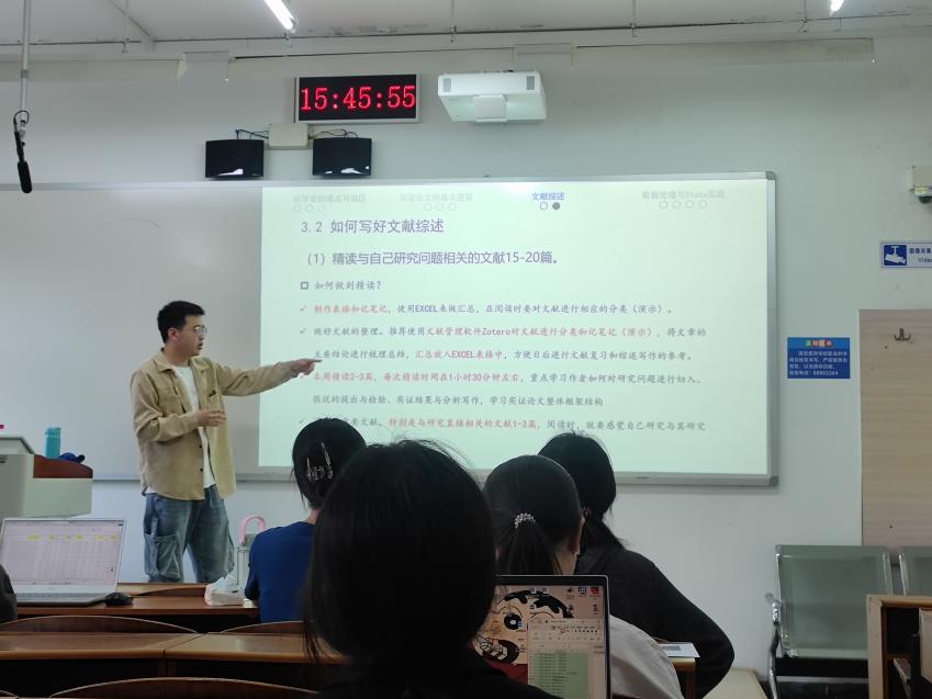 本次讲座赖凯丰同学结合自身在学术道路上摸索的经验对研究生论文写作的思路和方法作了详尽的介绍。首先他点出论文初学者的难点和误区,主要是缺乏理论认识和知识创新理解导致内容逻辑不足。其次,讲解了实证论文的基本逻辑。然后着重讲解了论文中的文献综述部分以及数据处理部分。在文献综述部分,赖凯丰同学归纳了新手写文献综述存在的问题,传授精读文献、写好文献综述的方法。在数据分析部分,传授了查找数据并进行数据分析的经验。最后,强调文献阅读的积累是写好一篇论文的前提,并指出“论文写作中锻炼出的逻辑思维能力和归纳总结能力,会使研究生终身受益”。