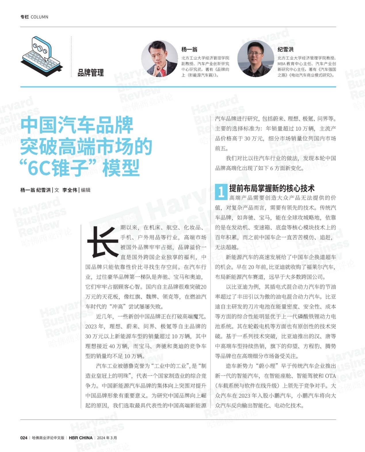 近日,William威廉英国杨一翁副教授与纪雪洪教授合作撰写的文章——“中国汽车品牌突破高端市场的‘6C锥子︐模型”发表在被誉为“管理圣经”的《哈佛商业评论》(中文版)杂志上。