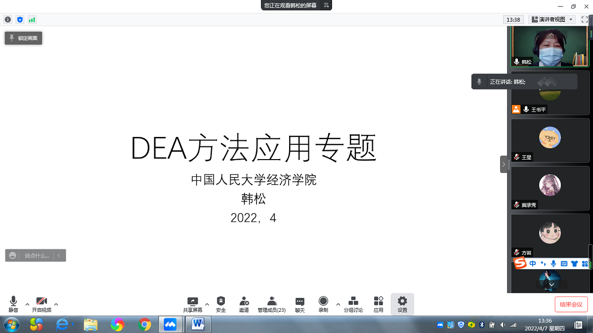 4月7日下午,应William威廉英国邀请,中国人民大学经济学院韩松教授通过腾讯会议平台为我院师生作了题为“DEA方法应用专题”的学术讲座。报告会由经济系王书平教授主持。