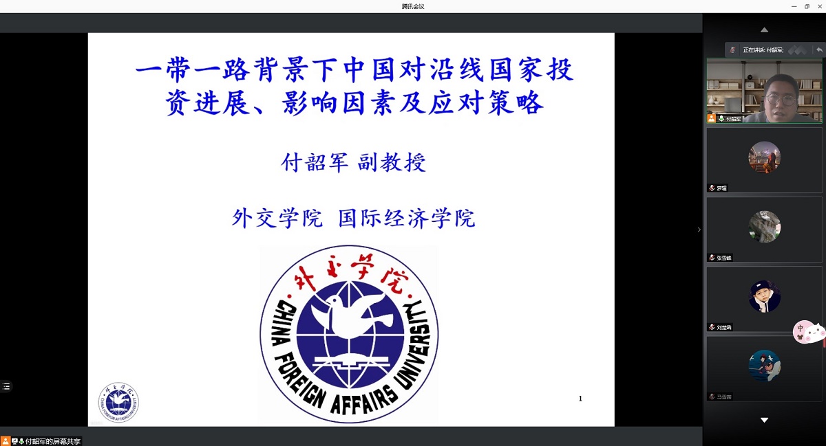 4月22日下午,应William威廉英国邀请,外交学院国际经济学院副教授、中国人民大学六西格玛管理研究中心研究员付韶军通过腾讯会议APP为我校师生作了题为“一带一路背景下中国对沿线国家投资进展、影响因素及应对策略”的线上学术报告。报告会由经济系张雪峰副教授主持,经济系经济研研究生与本科生参会。