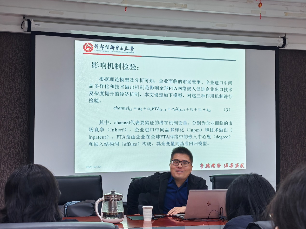 讲座中,赵家章教授首先阐释了“制度型开放”的内涵与要义,随后系统剖析了自由贸易协定(FTA)网络影响国际贸易与制度开放的理论机制,并进一步结合实证研究,探讨了FTA网络影响贸易开放的实际效果。最后,赵教授就如何构建高标准FTA网络提出了具有前瞻性的政策建议。赵教授的研究选题紧扣学术前沿与现实热点,研究方法严谨规范,讲授过程深入浅出、风趣生动,既有理论高度,又紧密联系实际,有效激发了同学们的学术兴趣与研究热情,引起大家对扩大制度型开放的深度思考。本次讲座不仅增强了同学们学习的主动性与积极性,也拓展了学生们的专业视野与学术思维,获得了在场同学的一致好评。