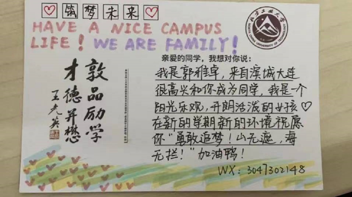 新生报到前期,经管学院的新生志愿者们以校园一角为背景,设计了系列特色明信片,并在入学时分发到每位新生手中。同学们在明信片上写下了自己对大学生活的希冀或对同学的鼓励,最后在新生之间进行随机交换。收到这封特别的“秋日来信”的同学们纷纷表示感受到了温暖和善意,受到了极大的鼓舞。