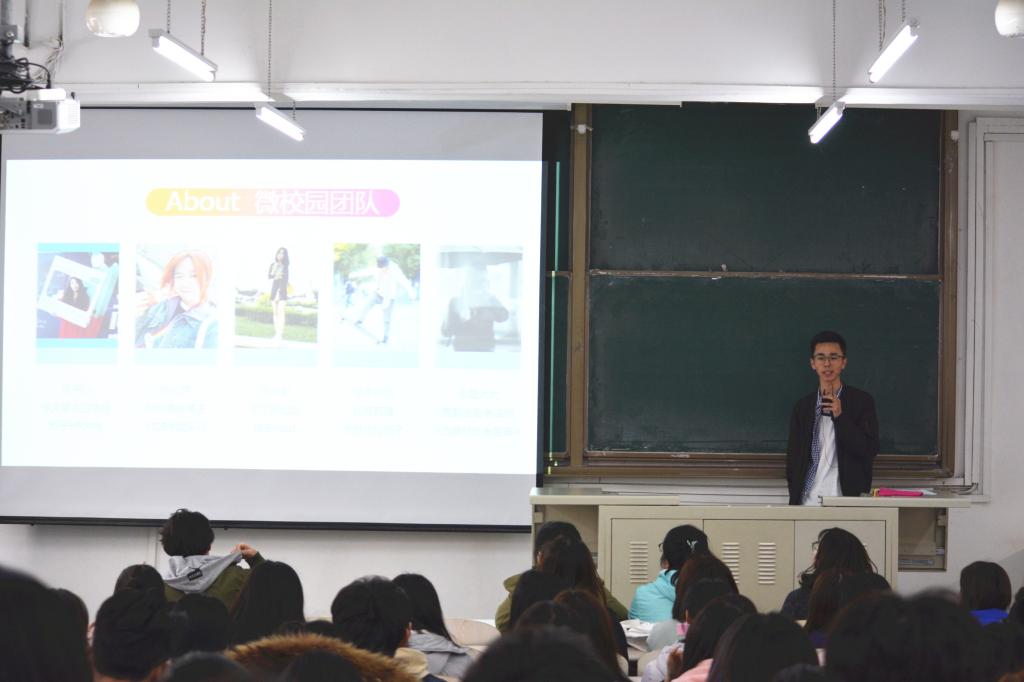 马可同学从自身管理运营微校园团队和校学生会宣传的经历说起,建议大家在工作中关注伙伴的成长,要身先士卒,同时要注重工作的仪式感,形成团队精神和团队文化。此外,他还向大家介绍了新媒体运营中标题的写法,展示了各式各样的朋友圈,生动地说明了标题的作用。