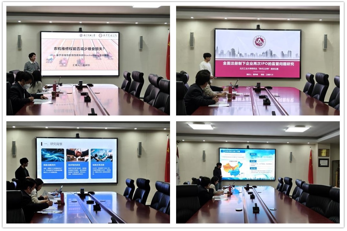 比赛中,参赛同学在三分钟内,围绕研究背景、核心问题、研究方法与创新点,以清晰的逻辑和生动的表达展示了各自科研工作。选题覆盖城乡融合区域协调发展、水资源治理、数字经济、企业IPO监管以及绿色低碳经济等前沿领域。选题视角新颖、内容丰富多彩,充分彰显了学院浓厚的学术氛围与同学们的科研广度。